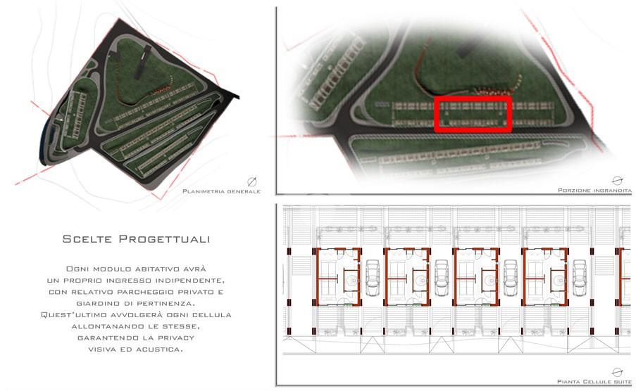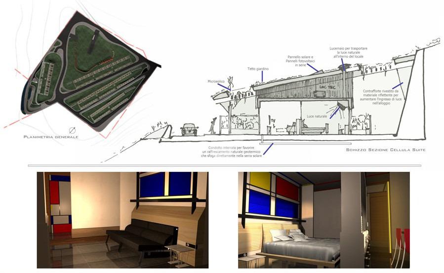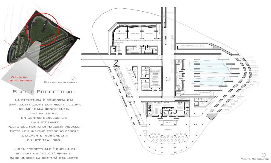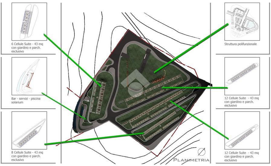 L'eventuale struttura è composta da: una accettazione con relativa zona relax – sala conferenze, una palestra, un centro benessere e un ristorante posto sul punto di massima visuale. Oltre a ciò prevede eventualmente la realizzazione, sfruttando gli indici di edificabilità del terreno, di circa 50 unità immobiliari. L’idea progettuale è quella di scavare un “solco” prima di raggiungere la somma del lotto. Ogni modulo abitativo avrà un proprio ingresso indipendente, con relativo parcheggio privato e giardino di pertinenza. Quest’ultimo avvolgerà ogni cellula allontanando le stesse, garantendo la privacy visiva ed acustica.